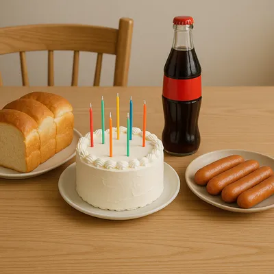 흰빵, 케잌, 탄산음료, 소시지